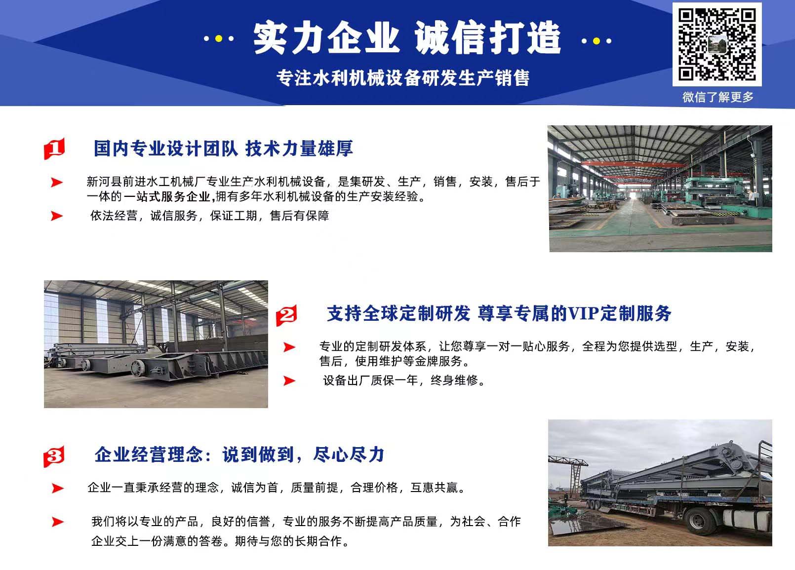 新河縣前進(jìn)水工機(jī)械廠是一家專門從事水利工程設(shè)備研發(fā)生產(chǎn)的廠家,現(xiàn)有員工228人,各類高、中級(jí)專業(yè)工程技術(shù)人員近30人,技術(shù)生產(chǎn)工人180多人。公司占地面積14674平方米。公司擁有車、鉗、刨、銑、冷作、鈑金、鑄造等,工種齊全,加工能力和技術(shù)力量雄厚,并具備理化測(cè)試手段與儀器設(shè)備。前進(jìn)水工專注景觀閘門,鋼壩,合頁壩,液壓升降壩,液壓閘門,臥倒門,一字門,人字門,液壓?jiǎn)㈤]機(jī),卷揚(yáng)啟閉機(jī),螺桿啟閉機(jī),清污機(jī),除污機(jī),閘門,拍門等設(shè)備的研發(fā)與生產(chǎn),是新河水利工程產(chǎn)品行業(yè)的領(lǐng)跑者,不僅在同行業(yè)群中揭起了一次又一次的技術(shù)革新,更為水利工程企業(yè)提供了更高更大的選擇平臺(tái)。